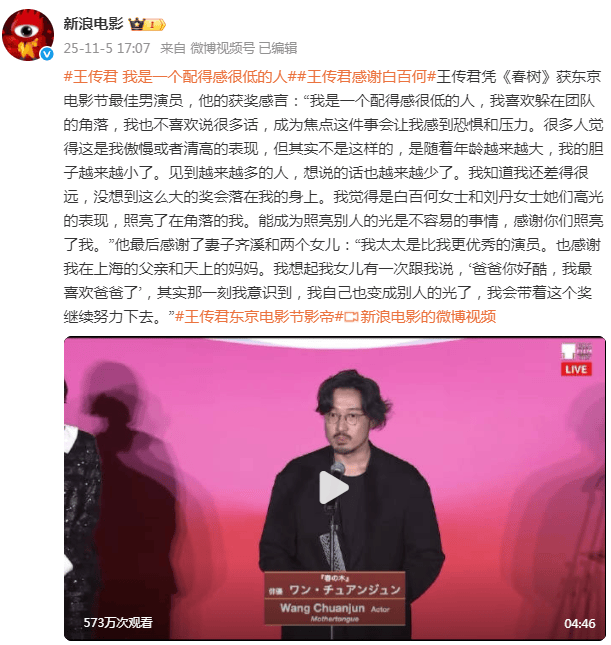 王传君上台领奖时的表情语气、获奖感言也被反复放大解读。他说自己配得感很低,喜欢躲在团队的角落,不爱说话甚至害怕成为焦点,很多人觉得他傲慢、清高,其实只是他年纪越大,胆子越小的表现。