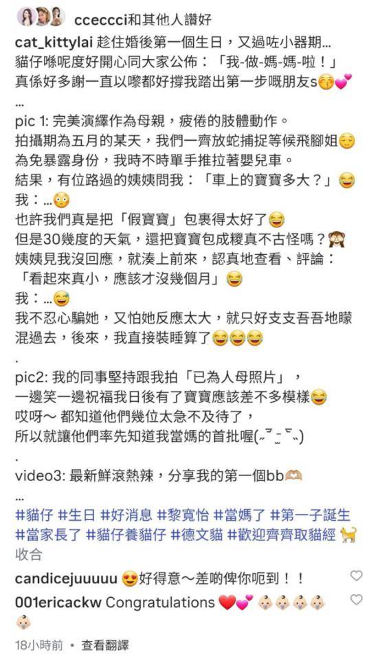 黎宽怡的多位圈中好友看到后,打趣道好可爱~差点被你骗到! 廖倬竩更是催促黎宽怡赶紧生小孩,做一个人类宝宝的妈妈。
