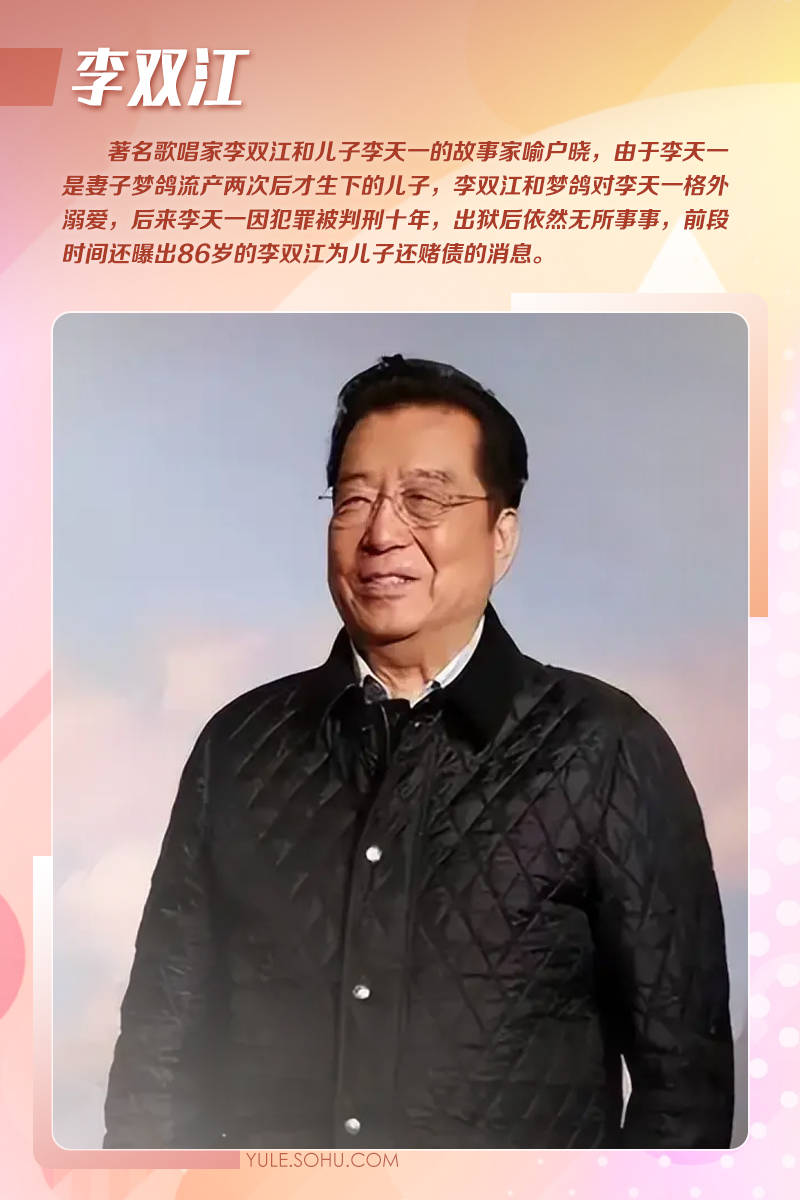 著名歌唱家李双江和儿子李天一的故事家喻户晓,由于李天一是妻子梦鸽流产两次后才生下的儿子,李双江和梦鸽对李天一格外溺爱,后来李天一被判刑十年,李双江的名声也因此扫地。出狱后的李天一依然无所事事,前段时间曝出李天一在美国欠下千万赌债,86岁的李双江为儿子还赌债的消息,还有消息称梦鸽变卖财产帮儿子填补窟窿。但也有知情人士辟谣称这个消息是误传,李天一已经改过自新。