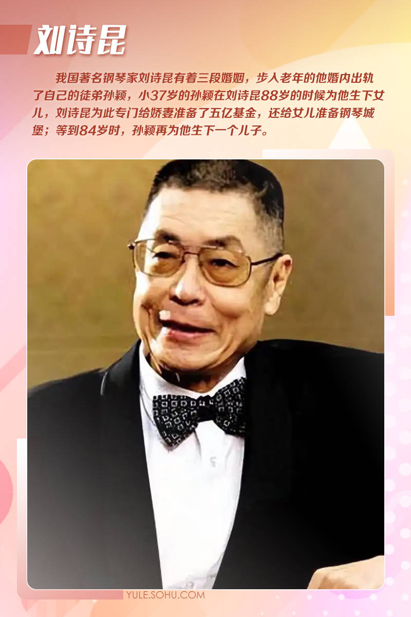 我国著名钢琴家刘诗昆有着三段婚姻,小37岁的妻子孙颖在刘诗昆88岁的时候为他生下女儿,刘诗昆为此专门给娇妻准备了五亿基金,还给女儿准备钢琴城堡;等到84岁时,孙颖再为他生下一个儿子。据悉孙颖早在2002年便冷冻卵子布局生育计划,单次产护费用超10万美元。