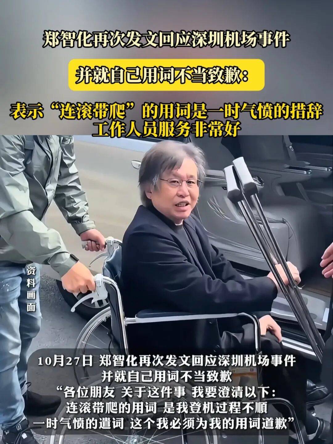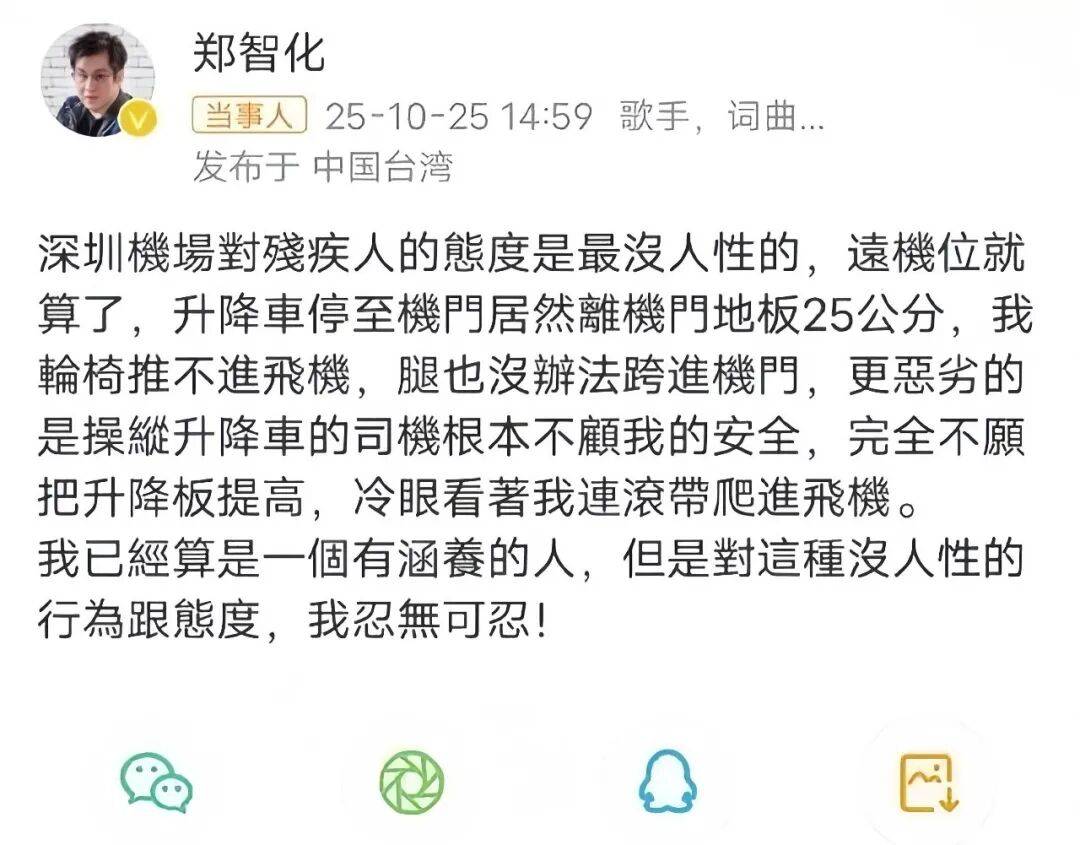 10月25日,郑智化在社交平台上发文说深圳机场对残疾人不友好(没人性),具体表现为升降车离机门地板高达20多公分,他的轮椅推不进飞机,腿也跨不进机舱门,操纵升降车的司机不愿把升降板提高,冷眼看着他“连滚带爬”进飞机。