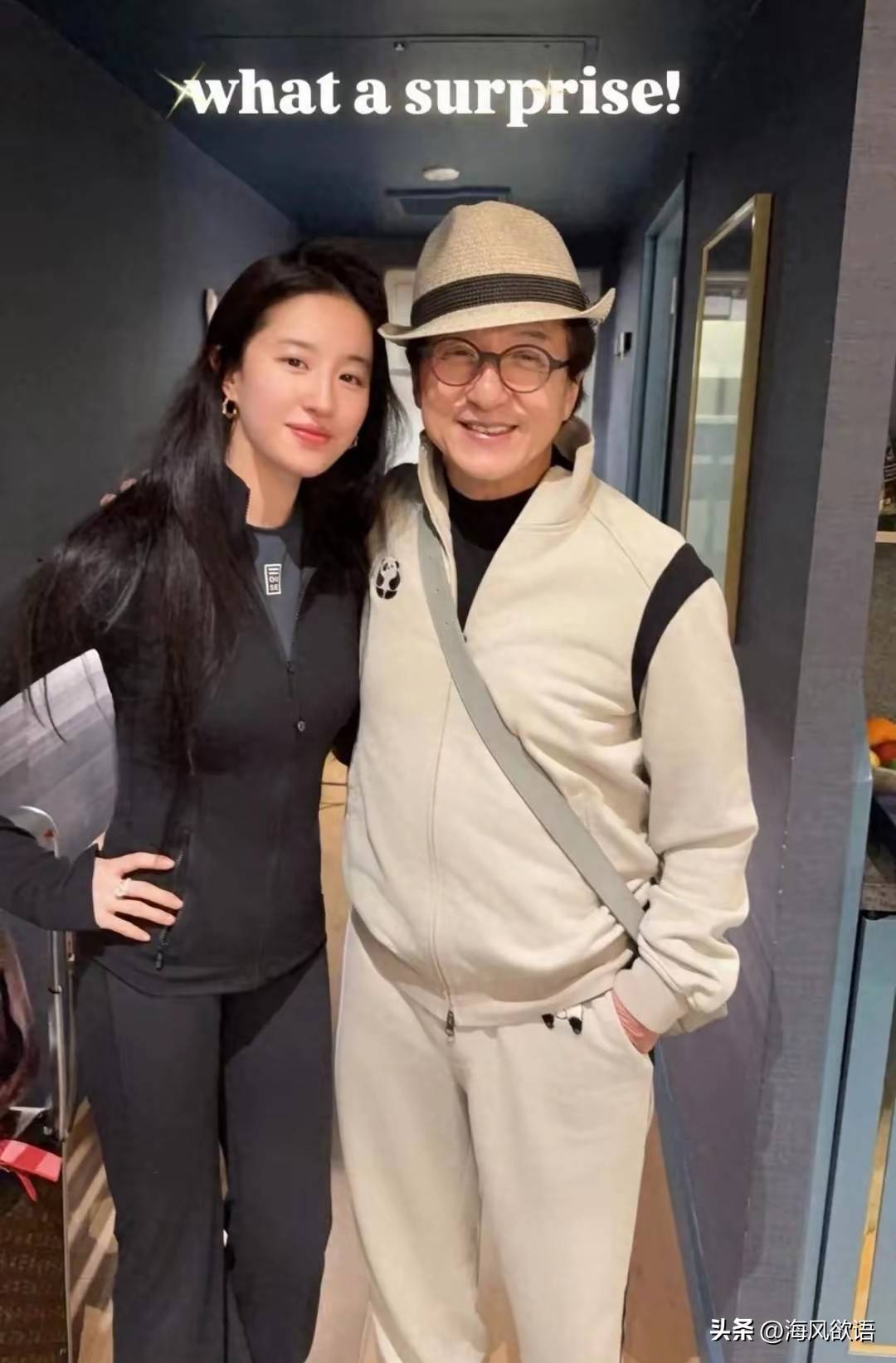 合照里能看出,刘亦菲素颜状态下气质照样能打,披肩滑落露出的侧脸柔和又精神,和成龙站在一起,像极了前辈看着自己带出来的后辈成了气候的骄傲模样。
