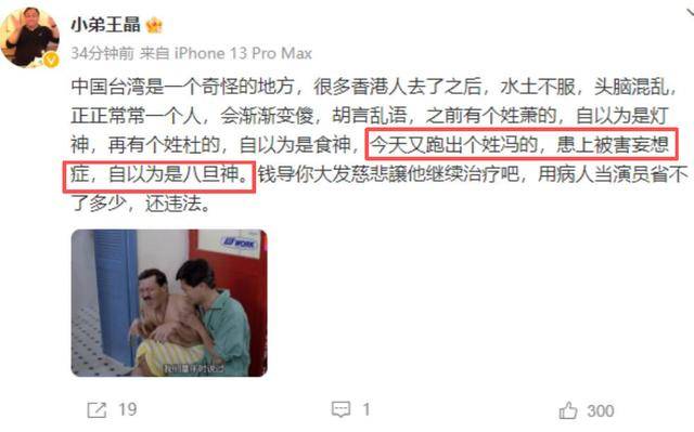 王晶也是丝毫没有惯着他的意思,直接发文回怼,表示他到台湾后已经变得不正常。