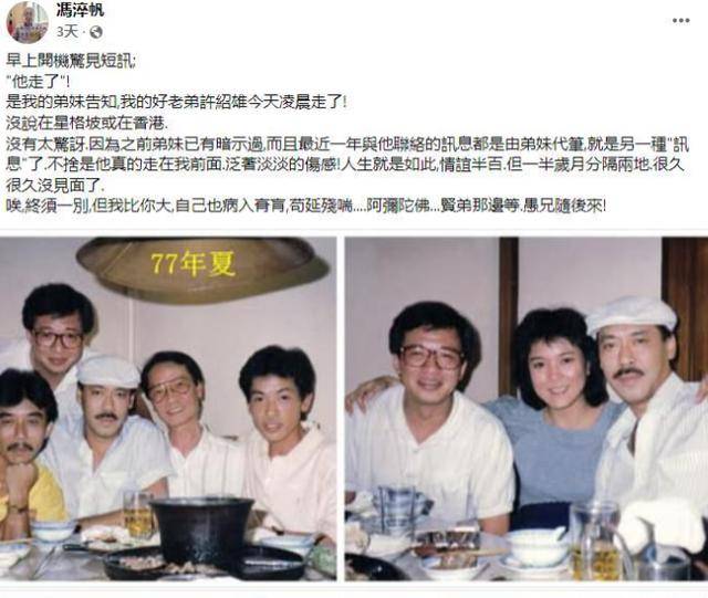 不久前,他的好友欢喜哥许绍雄去世的时候,他曾经发文悼念。