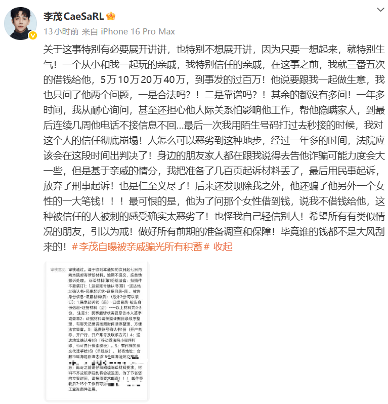 11月1日,“李茂自曝被亲戚骗光所有积蓄”引发热议。当晚,李茂发文称,已向合肥市瑶海区法院提起民事诉讼,案件正处于审核阶段。虽然亲友建议以诈骗罪报案,但他考虑亲情,只选择民事追偿,不再刑事追责。