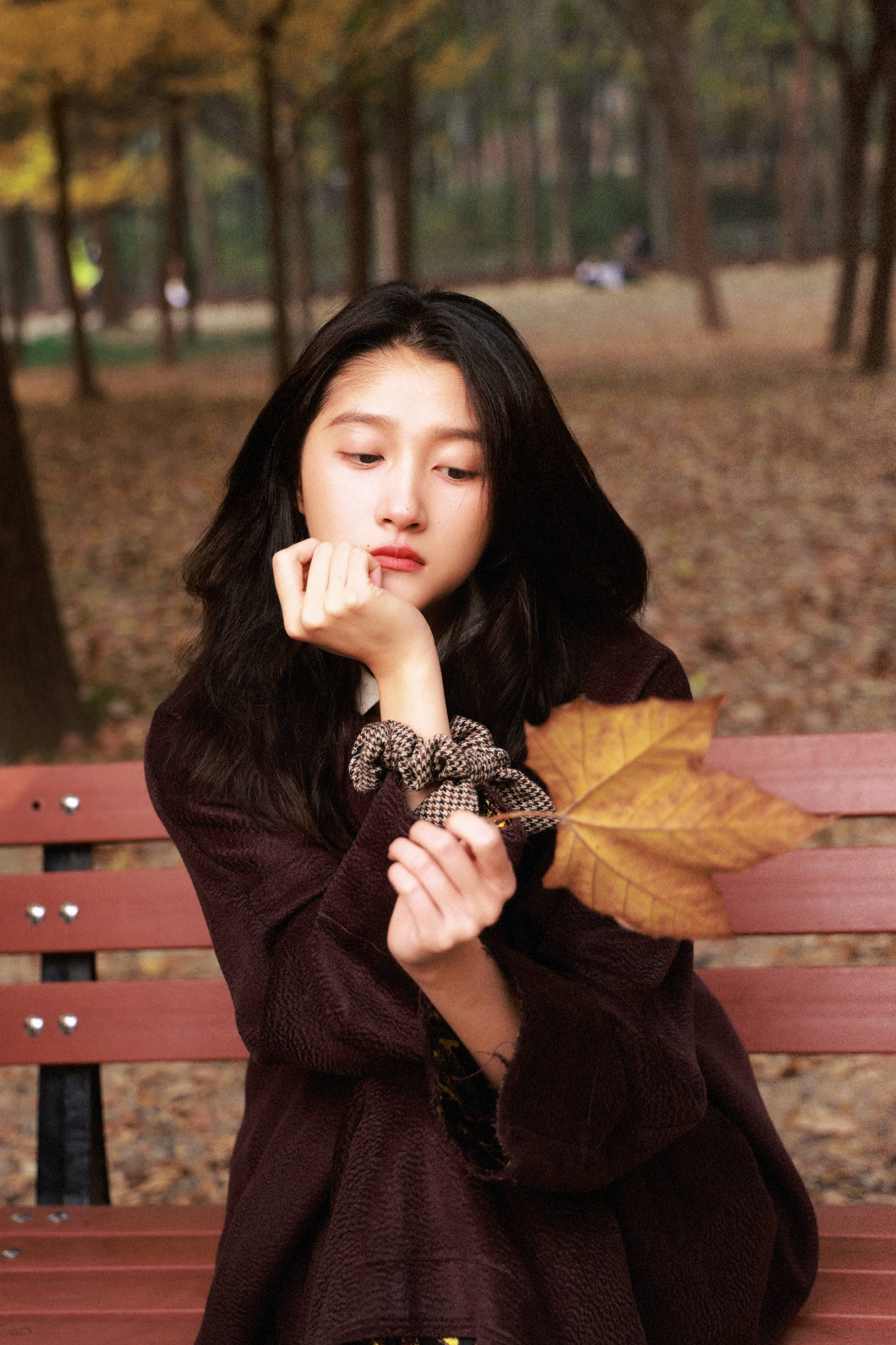 关晓彤拿着枫叶拍秋日氛围感美照。
