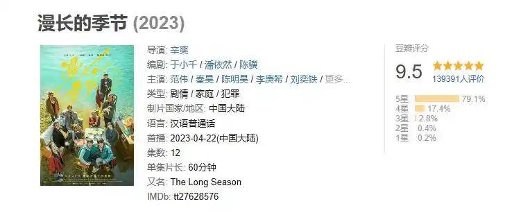 《漫长的季节》于豆瓣开启评分时为9.0分,随后分数持续攀升,直至达到9.5分,其口碑究竟是不是特别震撼呢?
