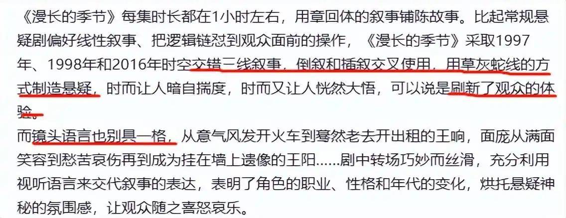 其次就是叙事手法巧妙、镜头语言不俗,人民网评的文章中还指出:《漫长的季节》采用了三线叙事方式,其中一条线设定在1997年,另一条线设定在1998年,还一条线设定在2016年,这三条线在时空上交错展开,并且倒叙与插叙交叉运用着。