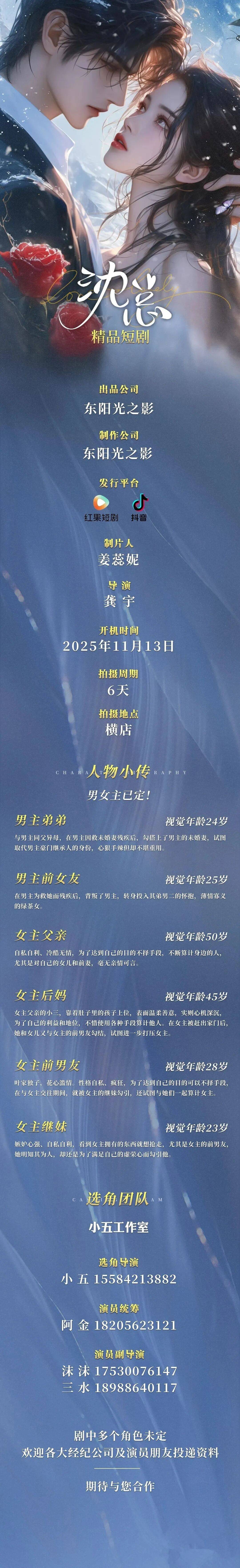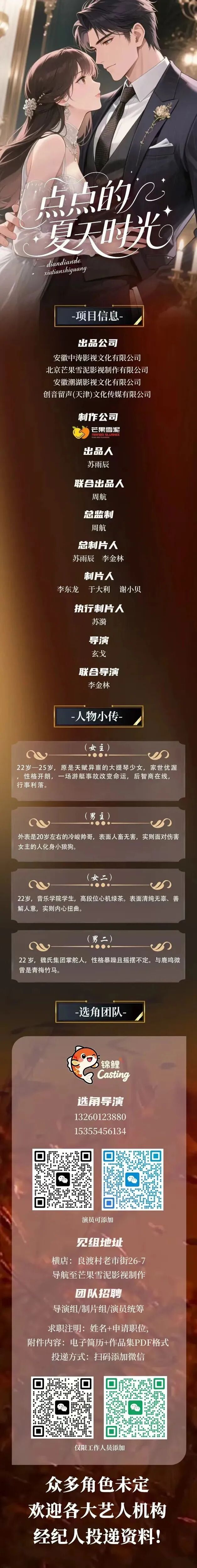 免责声明:戏客Seeker公众号(“本平台”)中全网组讯的信息、内容(“组讯信息”,包括但不限于影视项目名称、项目介绍信息、出品公司信息、导演信息、选角团队信息、拍摄相关信息、联系方式等)均来源于内容信息相关方提供或互联网公开信息。本平台不对组讯信息的真实性、准确性、完整性、及时性、关联性、适用性及安全性提供任何明示或默示的担保。请您谨慎参考或使用组讯信息,并确保您的人身、财产安全,本平台不对您使用或参考组讯信息而造成的后果承担任何责任。
