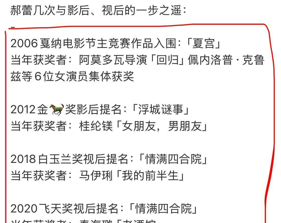 都说拿奖要靠天时地利人和,可是郝蕾总是差那么一点点缘分,几次跟影后、视后擦肩而过。