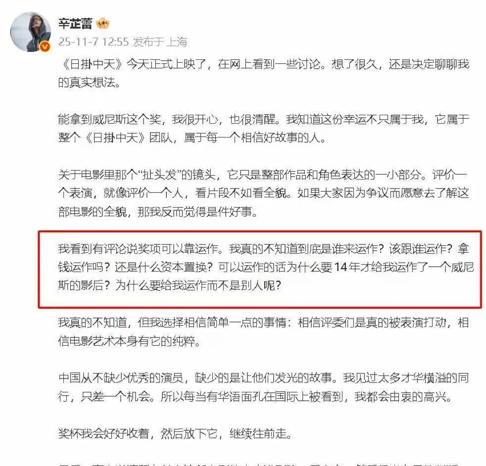比如说拿钱买奖、评委没有真本事之类的话都说得挺拐弯抹角,唯独有一句特别直白,就是说辛芷蕾在威尼斯拿影后没有什么含金量。