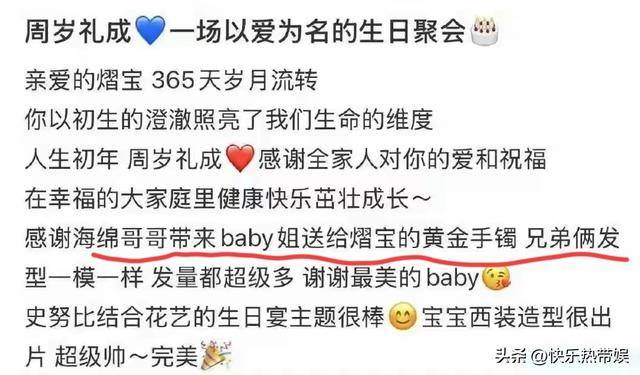宴会结束后,黄晓明弟媳还特意发文感叹一家人以孩子生日的名义团聚在一起,很是感动,谢谢大家对宝贝的祝福,而且还特意感谢了前嫂子杨颖:“感谢海绵哥哥带来baby姐送给孩子的黄金手镯,兄弟俩发型一模一样,发量都很多,谢谢最美的baby姐”!