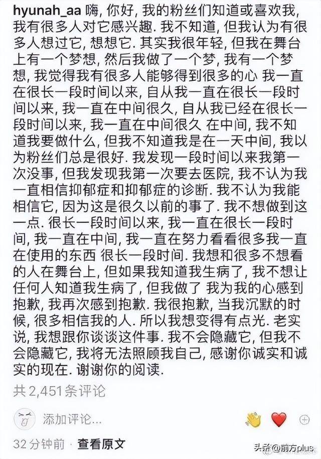 早在2019年,金泫雅就在社交平台发长文坦言自己患有恐慌障碍和忧郁症。“2016年去医院后才知道,这样一直坚强的我,无法相信自己患上了忧郁症和恐慌障碍”,而选择公开患病事实, 是“想要心情能稍微轻松一些”,并因状态不好对支持自己的人感到抱歉。