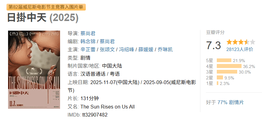 毕赣的新片大家在院线看不着,《日掛中天》可刚上映呢,目前豆瓣评分7.3,评价虽然褒贬不一,但斯文刷了几百条评论,观众贬的大多是剧情老套、剧本欠佳。
