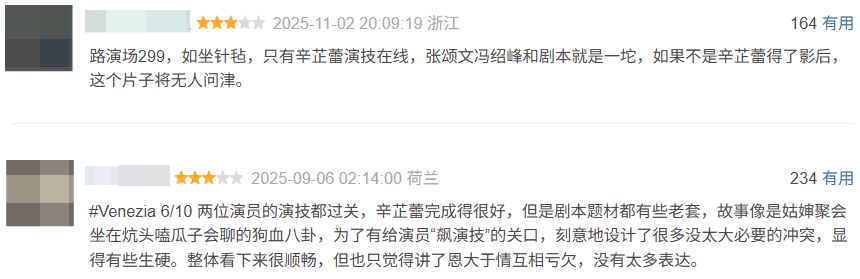 褒的则是“演员演技惊艳”、“演员完成得很好”、“辛芷蕾的表演值得一个影后”、“就算是为了看她也值了”。
