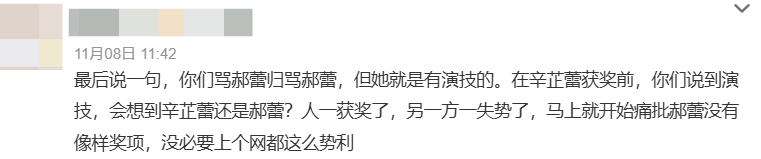 就像这回疑似郝蕾朋友圈事件,网友再怎么吐槽她“酸”,也不会有人质疑她的演技,因为我们同样很清楚,她的业务能力,早已无需奖项肯定。