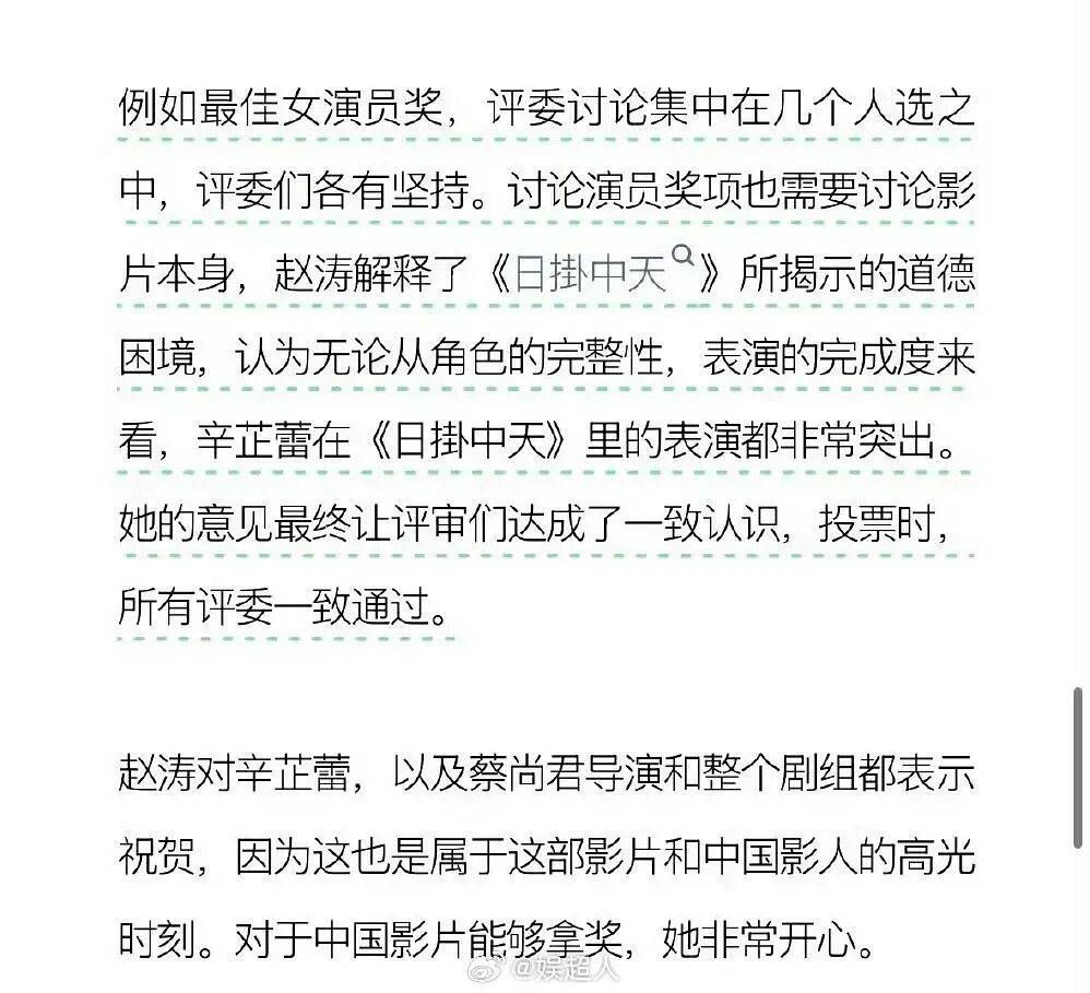当然,斯文毕竟不是演员也不是评委,奖项背后到底存不存在所谓的“运作”,说实话咱也不清楚。我记得辛芷蕾拿影后的时候,#赵涛撕奖能力# 这个关键词上过热搜,当时不少网友还夸她是“为国争光”来着。