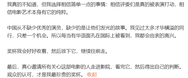 再加上“相信评委们是真的被表演打动,相信电影艺术本身有它的纯粹”、“中国从不缺少优秀的演员,缺少的是让他们发光的故事。我见过太多才华横溢的同行,只差一个机会。所以每当有华语面孔在国际上被看到,我都会由衷的高兴”等表述……