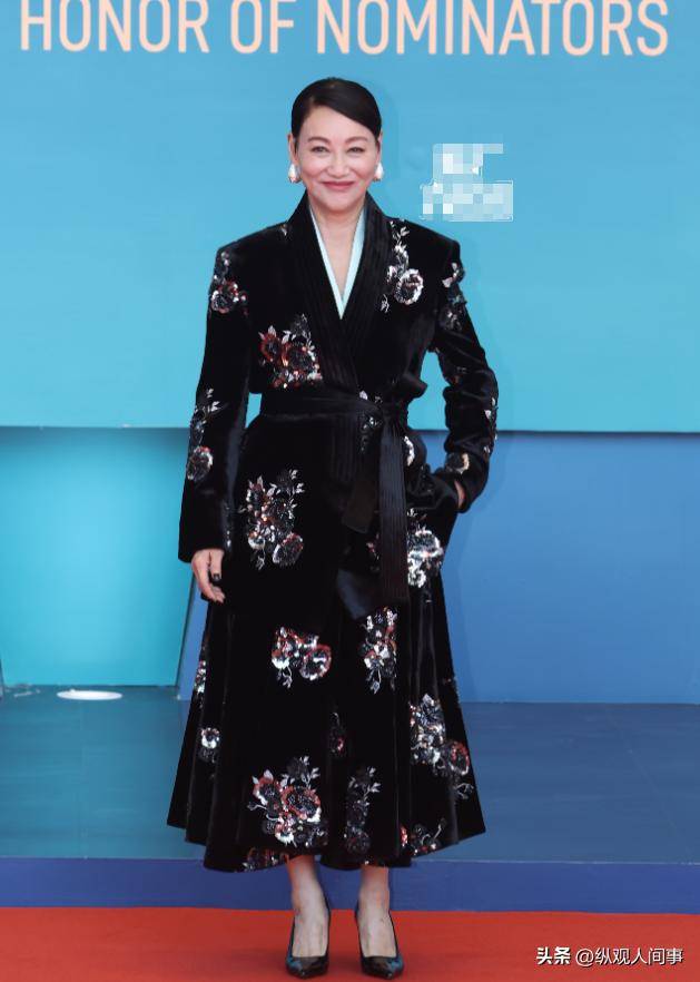 再看下演员惠英红,当天,她穿着一件黑色丝绒大衣,戴着夸张的耳环,看起来非常有气势,像个女企业家似的。