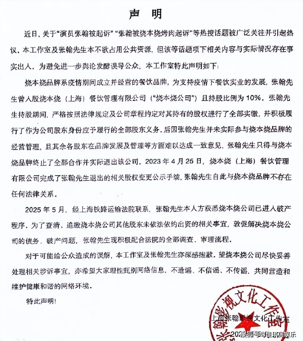 对此,张翰工作室紧急发布声明称张翰早已退出公司,与该品牌不存在任何法律关系。