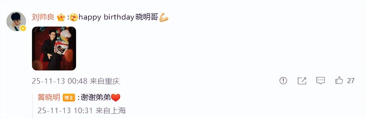 在那条自发的微博生日状态下,演员刘帅良为黄晓明送上了真挚的祝福。