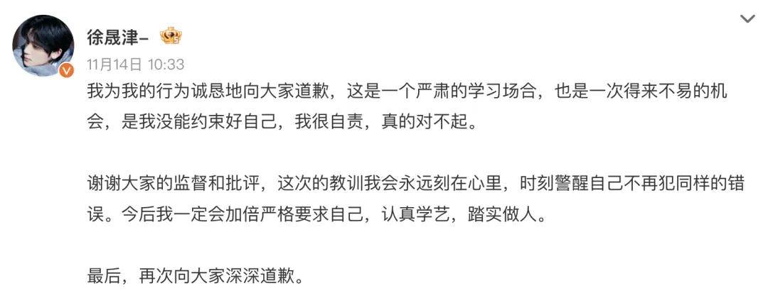 11月14日,徐晟津发文道歉: