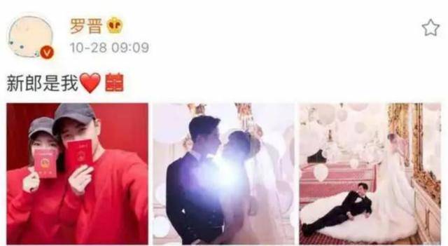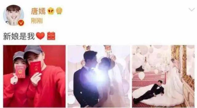 2018年10月28日,唐嫣、罗晋通过微博官宣结婚喜讯,大方晒出九宫格合影,两人分别配文“新娘是我”“新郎是我”。