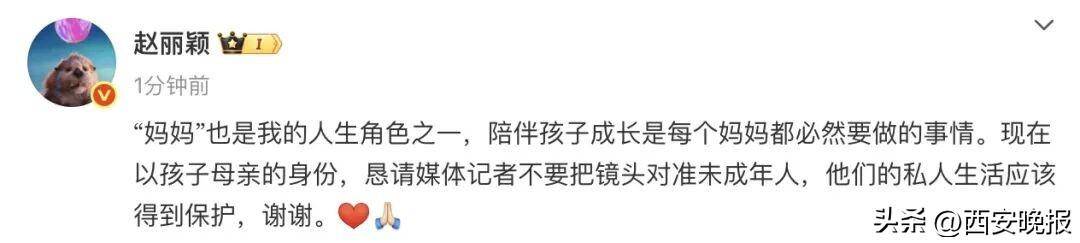 19日晚,@赵丽颖 发文抵制:“‘妈妈’也是我的人生角色之一,陪伴孩子成长是每个妈妈都必然要做的事情。现在以孩子母亲的身份,恳请媒体记者不要把镜头对准未成年人,他们的私人生活应该得到保护,谢谢。”
