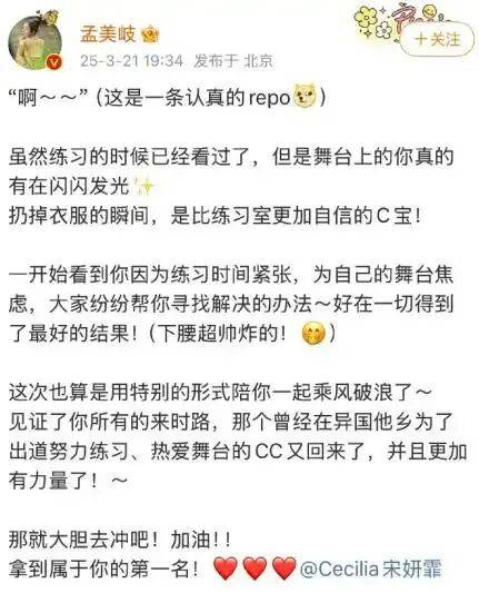 结果这个在忙的孟美岐呢,卡着吴宣仪下播的一分钟之内,专门为宋妍霏写了长文打call。