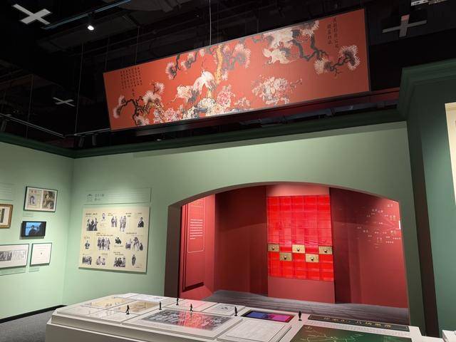 在低头观展的同时,也不要忘记抬头看看头顶的喜幛。大红底色,绣着精美的“玉堂富贵”和“松鹤延年”吉祥图案,有着极好的寓意。阮珺介绍,喜幛由长逾四米的1926年民新影片公司开业贺礼粤绣等比例缩小而来。该粤绣是仅此一份的珍品,上海电影行业百年繁荣的直接物证。