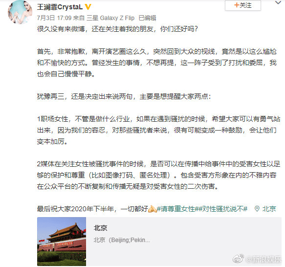 但当事女演员王澜霏也发了微博,呼吁女性“如果遇到性骚扰,希望有勇气站出来”。