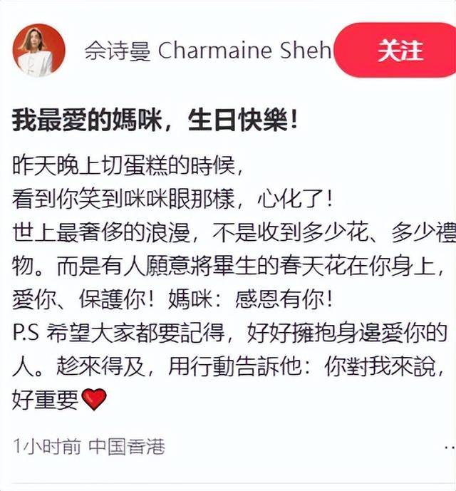 想来这一段文字,是佘诗曼在经历过干爹去世后才有的感悟,也让她更加珍惜和妈妈在一起的日子。