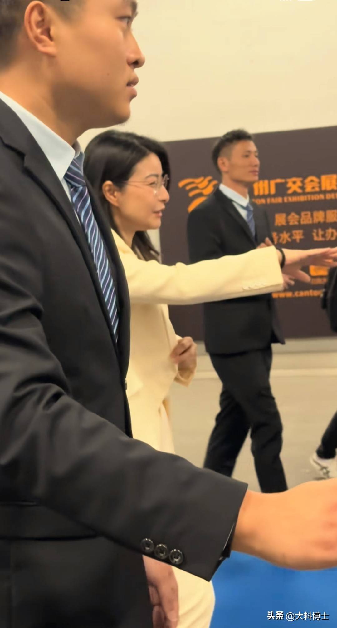 有安保人员在前面为其开道,阻止围观群众拍摄,郭晶晶委婉地阻止了安保人员这种行为,招手示意他们不必如此。