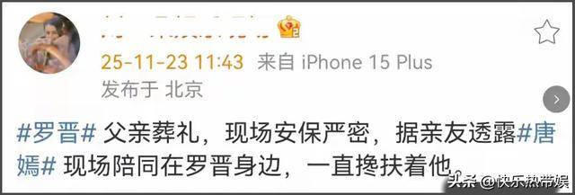 11月23日,农历十月初四,男星罗晋父亲在八宝山举行了葬礼,现场安保工作到位了,葬礼尽然有序,罗晋作为家里独生子捧着父亲遗照走在前面,而唐嫣则是跟着亲友走在后排,这明显人一看就是按照儿媳的站位来的,葬礼未见两个小孩参加。