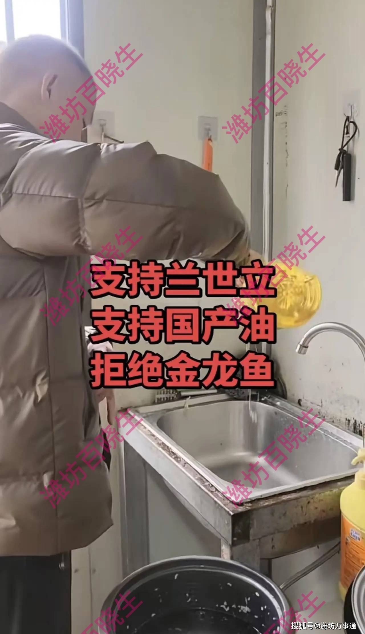这件事情遭到媒体报道之后,网上出现了一大堆支持兰世立的网友。比如有一个男子,就在那表示要支持兰世立,拒绝金龙鱼。在视频当中,我们可以看到他拿了一壶金龙鱼的油,将油直接倒入了下水道冲掉。而他之所以这样做,就是想带动更多人的跟他一起去抵制金龙鱼,去支持兰世立。