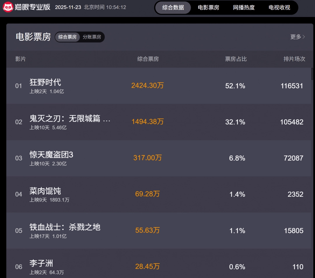 此前,《狂野时代》荣获第78届戛纳电影节主竞赛单元特别奖,新晋金鸡奖最佳男主角奖易烊千玺的出色出演也让该片人气超高。上映2日来,冲上猫眼票房排行榜第一。