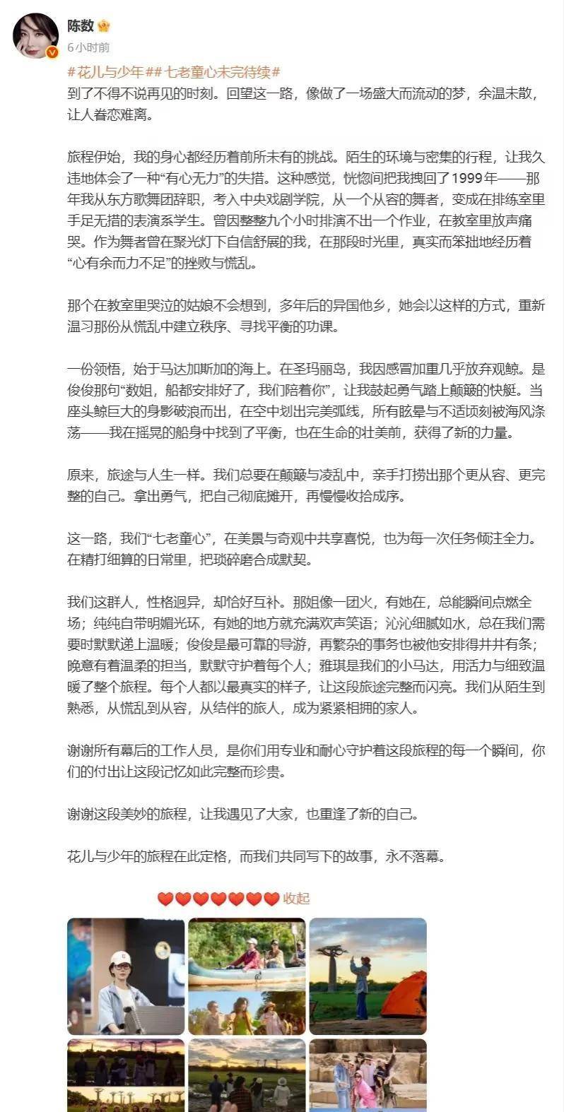 陈数的千字长文堪称收官日的"重磅炸弹"。她坦然剖析不同性格的碰撞磨合,将这次经历视为自我突破的挑战。当看到最后"挑战成功"的宣言,谁不为这群人的相知相惜动容?