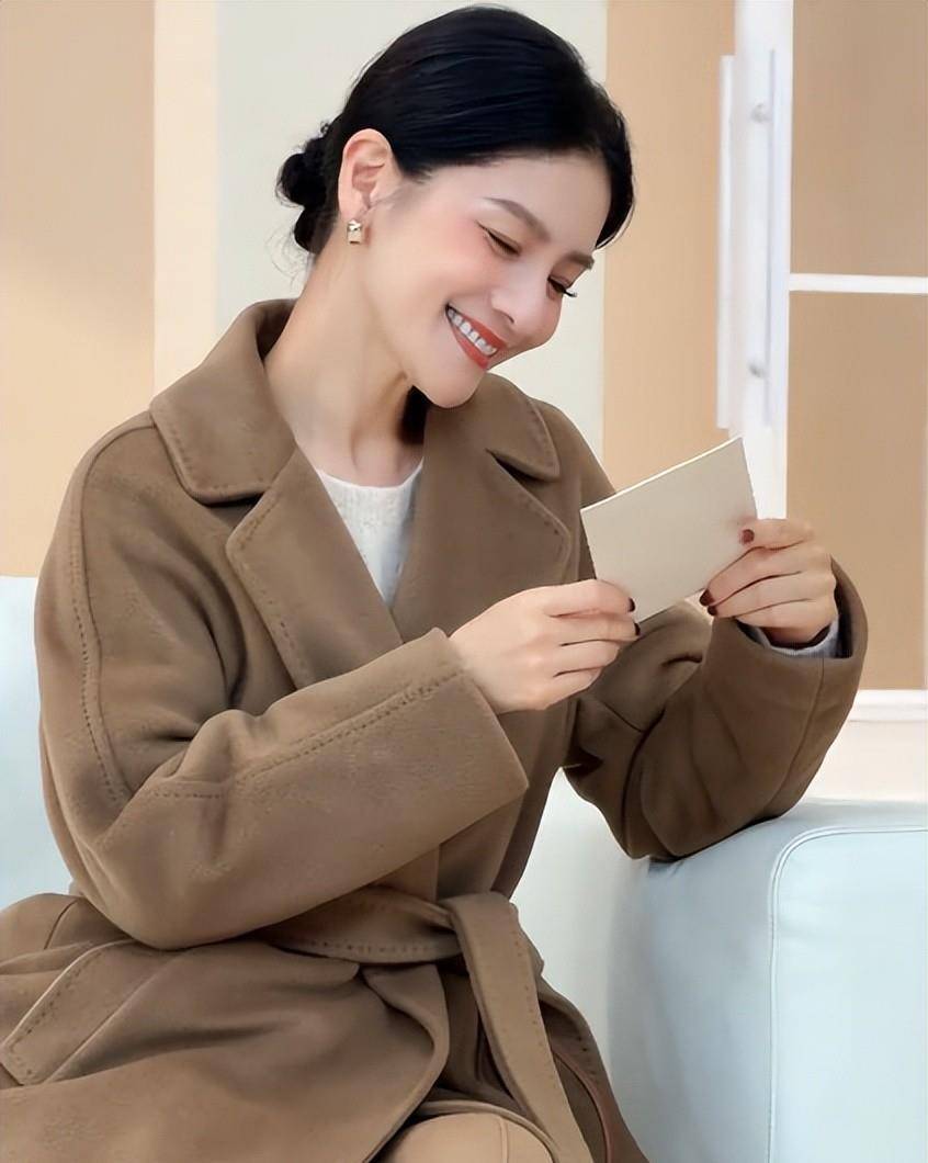 她漫步走进一间温暖小屋,坐在沙发上翻阅卡片,不知看到什么有趣内容,笑得格外开心。整个画面宛如冬日童话,温馨又治愈。