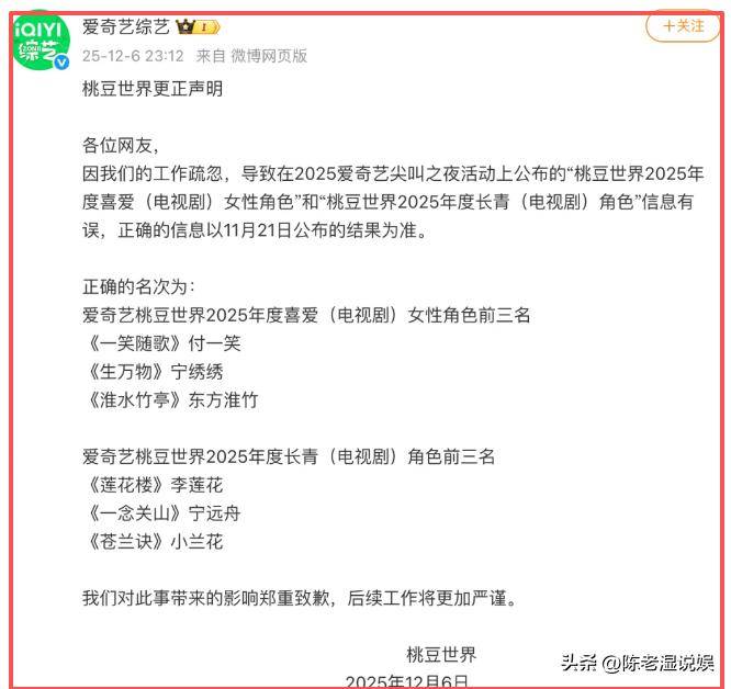 “因工作疏忽,导致在2025爱奇艺尖叫之夜活动上公布的“桃豆世界2025年度喜爱(电视剧)女性角色”和“桃豆世界2025年度长青(电视剧)角色”信息有误,正确的信息以11月21日公布的结果为准。对此事带来的影响郑重致歉,后续工作将更加严谨。”