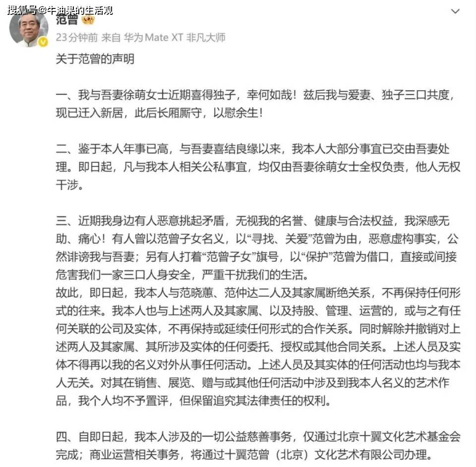 没想到12月11日,范曾在失联风波后首现身,官宣自己喜得独子的好消息,并且宣布与亲生女儿和继子断绝关系。