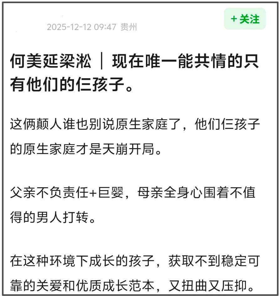 更让人感慨的是那个一度火上热搜的“争外套事件”。当时大家都觉得梁淞对妻子不够温柔体贴,可如今回头再看,何美延在整件事乃至整个婚姻里,似乎都像个没长大的、需要被全方位照顾的“小女孩”,而不是三个孩子的母亲。当然啦,梁淞的问题也一点不少,作为丈夫和父亲,他的担当同样缺席。这对小夫妻,仿佛还停留在恋爱的梦幻泡泡里,却把婚姻中最实在、最沉重的育儿责任,一股脑儿地转移到了老母亲瘦弱的肩膀上。