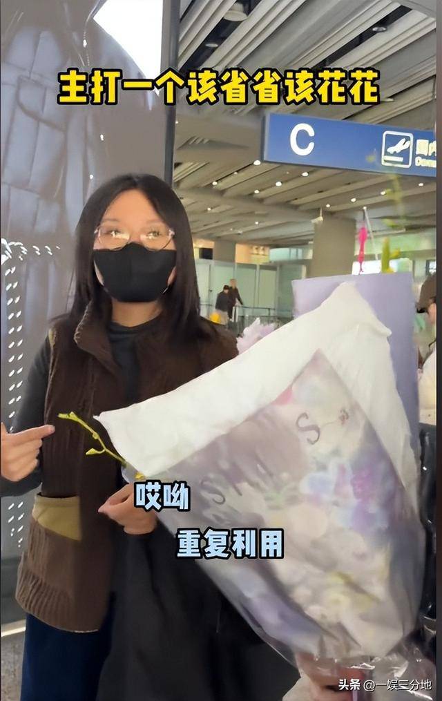 她去机场接同学,就在室内穿搭里加了一件黑外套,戴了个口罩,可以说是非常低调了。