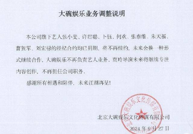 2024年9月,大碗娱乐发了公告:把艺人经纪的活儿砍了,只留下写剧本、拍作品的核心业务;贾玲自己也辞了所有管理岗位,就只保留老板的身份。