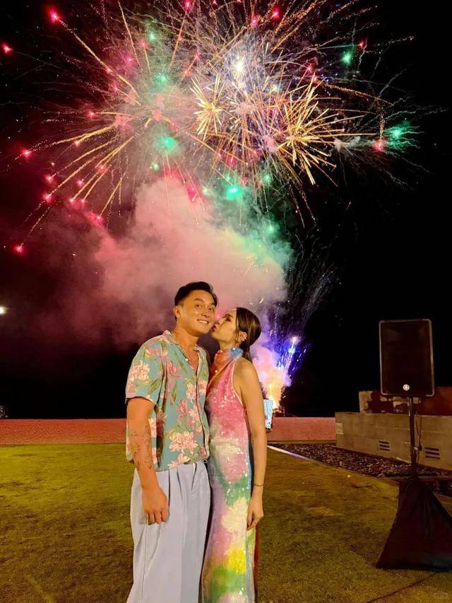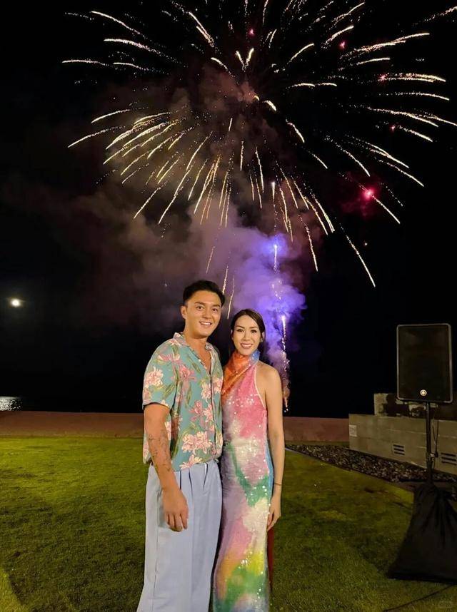 当晚庄思明身穿露背长裙,刻意转身大晒白滑美背,在烟火背景下向男友连环送吻,画面甜度爆表。杨明站在一旁笑得满足,两人互动自然,完全不像拍拖多年的「老夫老妻」。