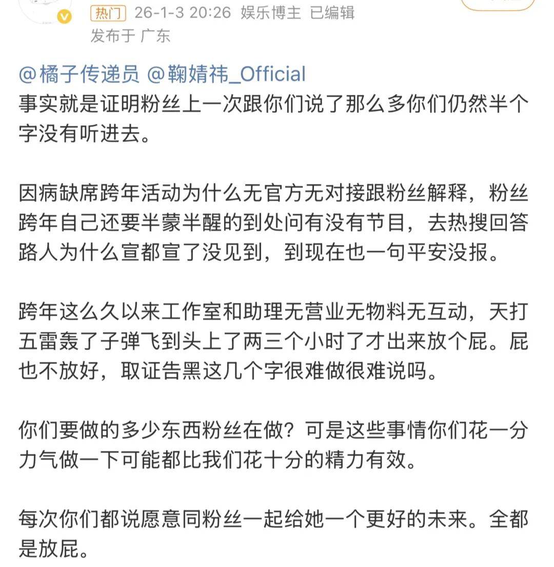 虽然粉丝那边也有统一说法应对,关于B站跨年舞台取消,粉丝澄清并非刻意缺席,而是原本敲定的是合作舞台,鞠婧祎早早完成了部分内容的录制,结果后续合作对象因故无法到场,节目组只能临时调整方案,把合作舞台改成了她的个人节目。