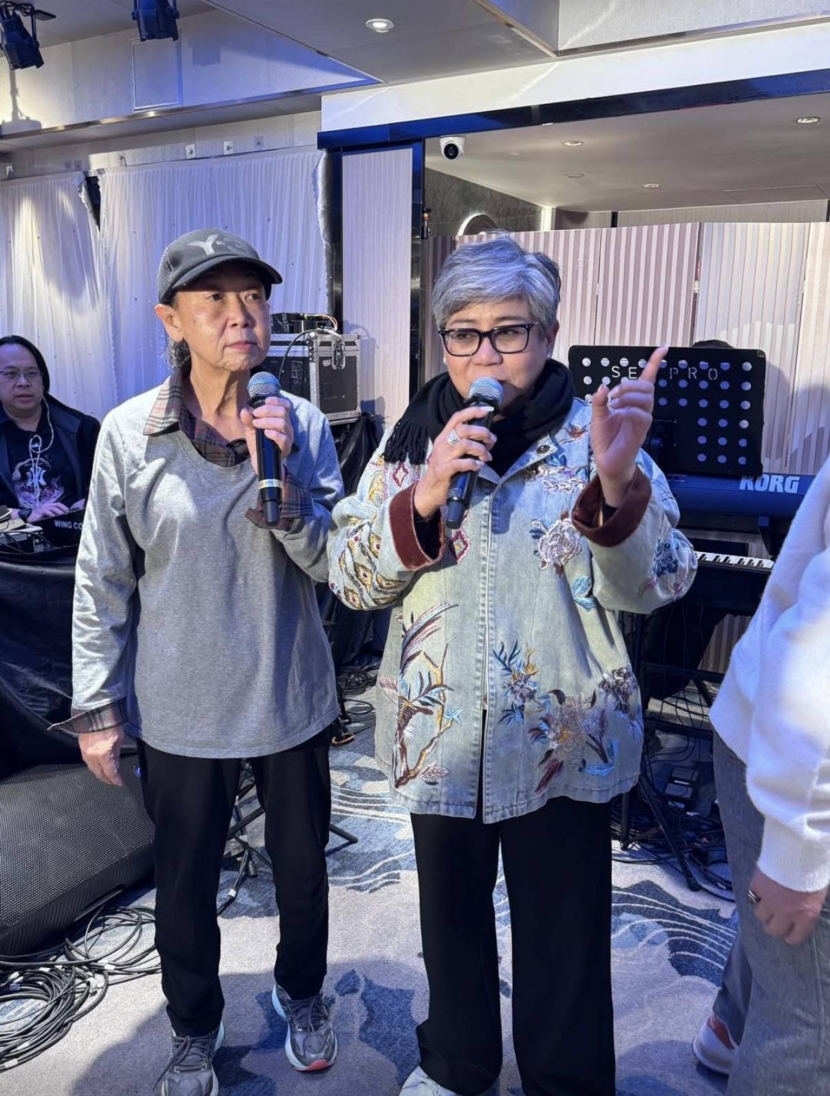 现场既是寿宴,同时也是歌唱会。黑妹是歌手,热衷唱歌,而请来的一众嘉宾中也有不少是歌手,所以酒足饭饱之后,大家登台献唱,一曲又一曲,令人大饱耳福,其中罕见的是久未在香港露脸的资深艺人朱咪咪。朱咪咪在2021年结束了与TVB的合作之后,就淡出了娱乐圈,返回了新加坡生活,这些年偶尔来香港登台演出,作风一直很低调。此次在黑妹的寿宴上登台,差点就认不出她了。朱咪咪当天穿了黑色的羽绒服,非常低调,而且没有化妆,几乎是以素颜的状态露脸,重点是她瘦了很多,脸都凹陷了下去,不过她的精神面貌还不错,在场仍然发挥幽默的本色。