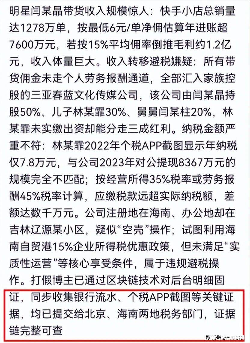 举报材料中的资金流水更令人咋舌:仅儿子林傲霏三年前就从公司对公账户提现8367万元,却仅缴纳7.8万元个人所得税,远低于法定税率。而闫学晶的直播带货累计销量超1278万单,按行业最低6元/单的佣金计算,仅此项收入就超7600万元,再加上短视频广告等收入,总收入堪称天文数字。业内人士估算,2022至2024年间,她及其关联公司偷逃税款可能超3800万元,若加上滞纳金和罚款,总额或将接近1.2亿元,一旦核查属实,最高可面临7年有期徒刑。