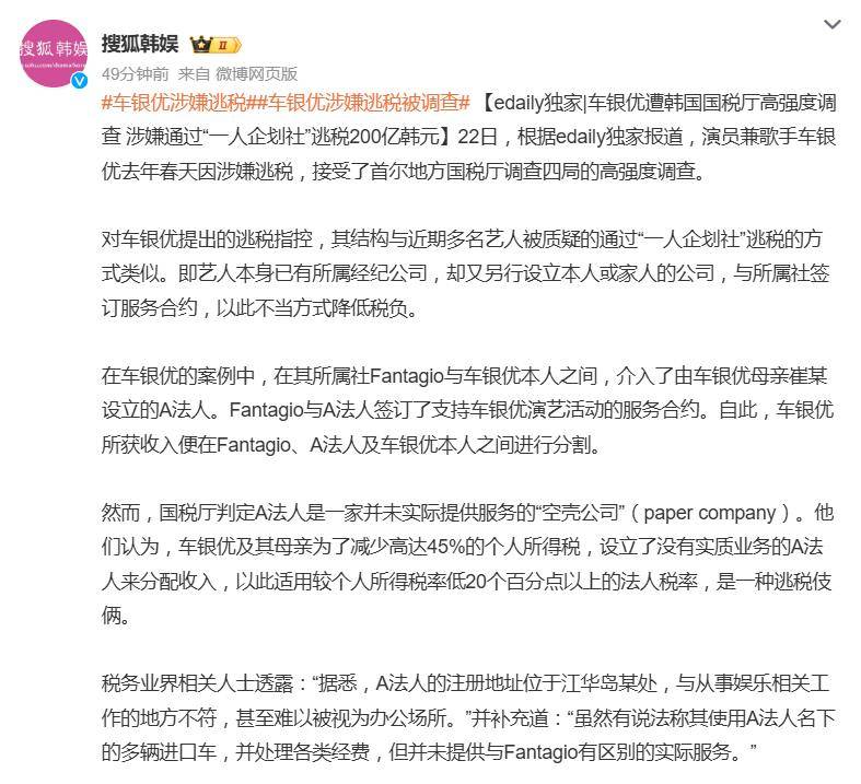 调查结果更是给了这套说辞一记重锤。国税厅发现,这家A法人既无实际办公场所,也无提供服务的人员,根本未对车银优的演艺活动提供任何区别于Fantagio的实质性服务。其唯一功能,似乎就是“分散收入”。因此,车银优个人被认定需追缴超过200亿韩元的个人所得税。连他的经纪公司Fantagio也因处理与A法人相关的虚假税务发票,被追缴了82亿韩元的增值税,且申诉已被驳回。