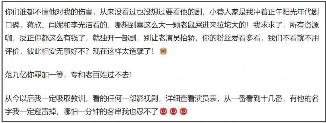 “资源咖”不可恨,可恨的是很多都“德不配位”。偶像剧市场上,范丞丞曾和一线扛剧花杨紫合作过《要久久爱》;正剧市场上,他曾在正午制作、闫妮和蒋欣等一众实力派参演的《小巷人家》中饰演重要角色。可是,无一例外,他成了拖后腿的存在,还以一人之力拖垮《小巷人家》整部剧的口碑。