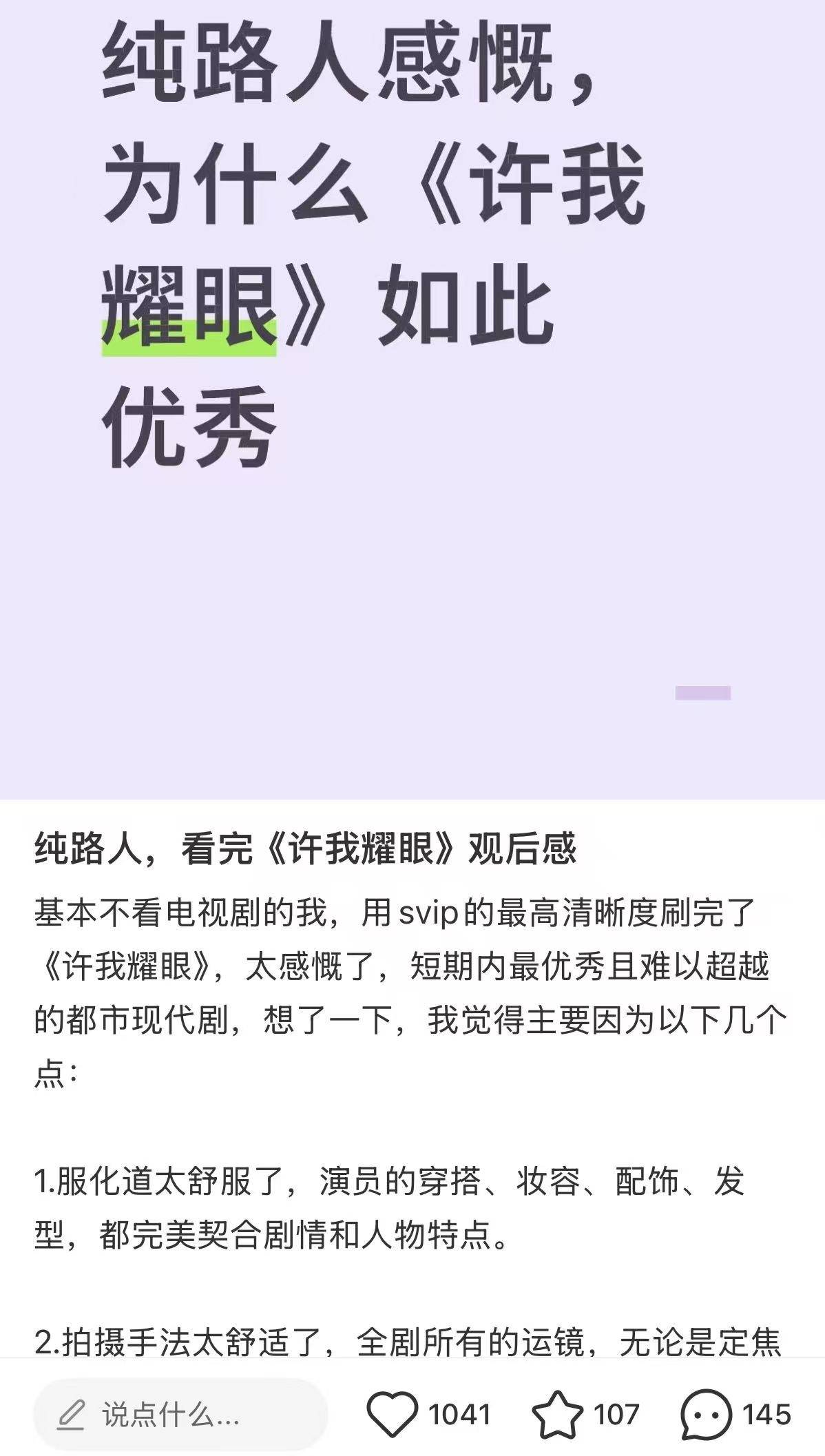 一些头部剧集也在这样的圈层共振下将热度推向极致。就比如爆剧《许我耀眼》内容被拆解为各种可被再创作的“社会切片”。“妍学”成为职场与女性议题的讨论入口,许妍的穿搭与妆容被时尚、美妆博主反复演绎,让剧播期间全程都能衍生新鲜梗。也有博主另辟蹊径以“玩梗动人”,小红书上博主“阿中和阿秋”拍摄《许我辣眼之国庆假期余额不足》,结合国庆热点及剧中已出圈名场面进行模仿,引发评论区热议。